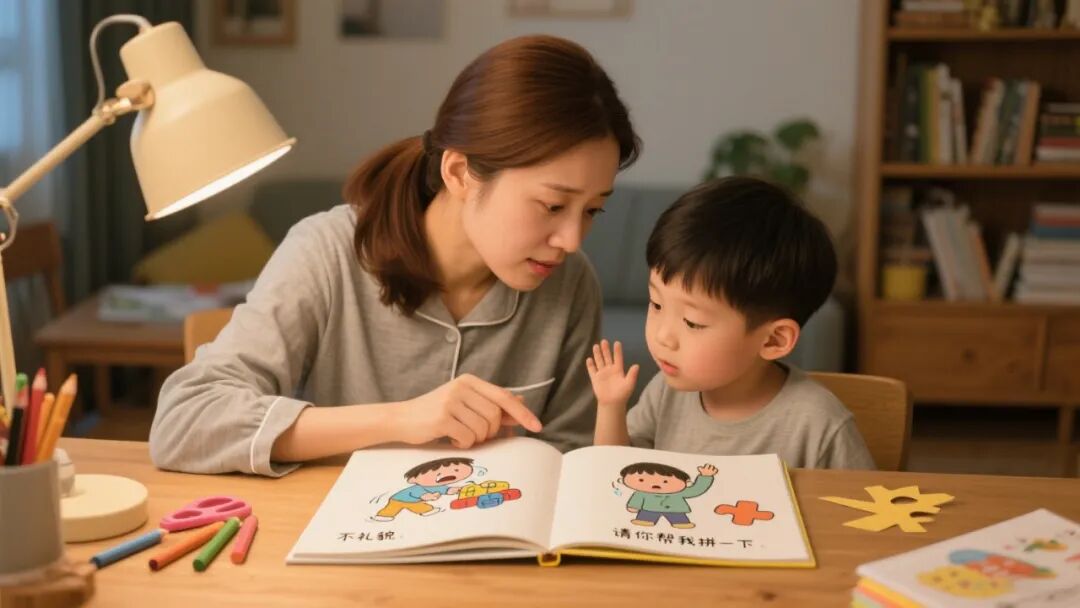 社交故事的运用:可选用市面上的礼貌主题绘本(高阶孩子完全能读懂),讲述时多结合孩子生活里的事,让故事里的道理和他的经历紧紧相连,加深对礼貌行为的理解。